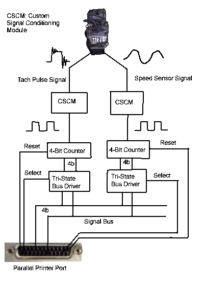 In stage one, our goal is to install the entire laptop computer into the car, and interface its parallel port to the vehicle's sensors. The four TTL input lines on the parallel port will be treated as a bus. 4-bit counters driven by conditioned signals from important sensors can be selectively attached to the bus and polled for the sensor's "count". Such a system allows for up to 6 input sensors with 4-bit resolution. The 12 TTL outputs on the parallel port will serve as data select/reset pairs for the six input devices.