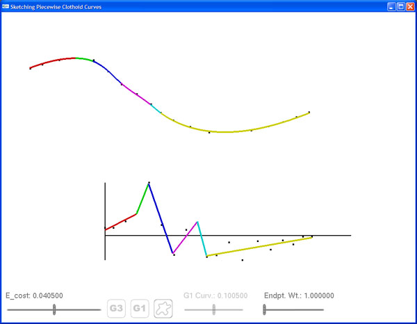 A paper I presented at the Fifth Eurographics Conference on Sketch-Based Interfaces and Modeling 2008, which received one of four "best paper" awards of 23 submissions. In short, the paper details an approach to fitting a piecewise clothoid curve to an input polyline. The approach is ideal for applications where stroke fairness takes precedence over precise interpolation of points.