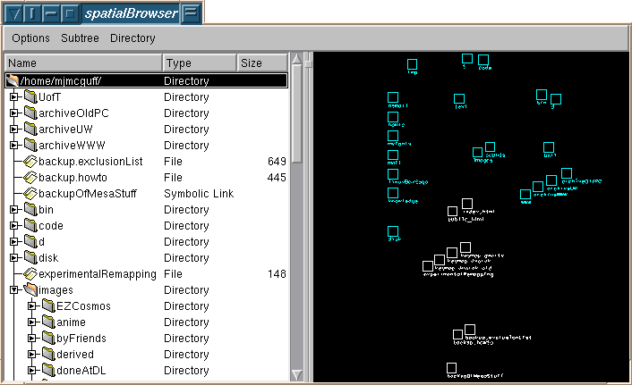 spatialBrowser is a file browser offering a dual view of files: a traditional tree list view, with expandable/collapsible nodes, and a 2D spatial view, where files can be freely arranged. The 2D spatial view shows the contents of the currently selected folder, and can be panned and zoomed with the mouse. The spatial layout of files within each folder is persistent across sessions. For some of the rationale behind the design, and references to relevant literature, go here [1].