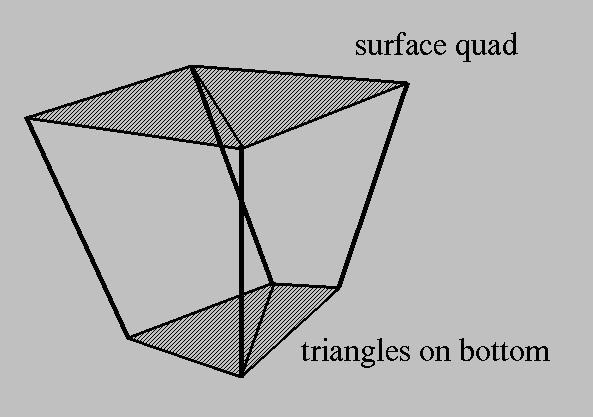 To generate the caustic texture I assume that the light source points straight at this surface, then for each vertex of every quad on the surface I compute the intersection of the refracted ray with a plane at some depth D. This is shown in the figure below: