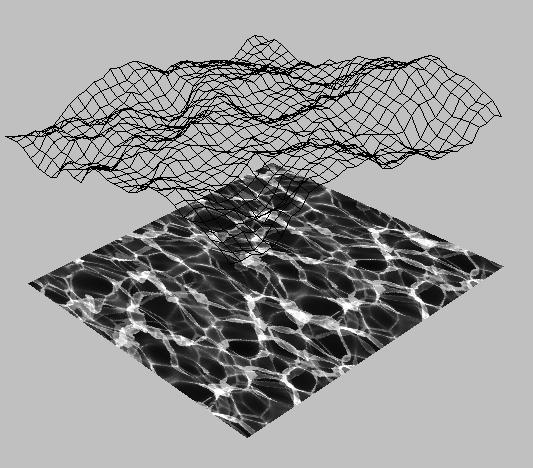Then I break up the quad into two triangles which I then shade using Open GL. The intensity is proportional to the area of the triangle. This makes sense since in regions of high focus the triangles are smaller than in regions of defocusing. The alpha blending implemented in OpenGL takes care of blending all the triangles.The figure below shows the computed caustic texture map along with the fractal surface: