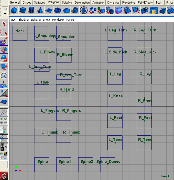 Once the skeletal system and the skinning weights were established, a character rig was created. Locators were used to control the movement of the joints using set driven key animation. A snapshot of the rig follows.