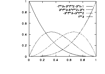 where f1(t) ... f4(t) are the functions obtained from the product T M. These are functions are called the blending or basis functions, because they serve to give a weighting to the various components of the geometry vector, G. In this case, these are