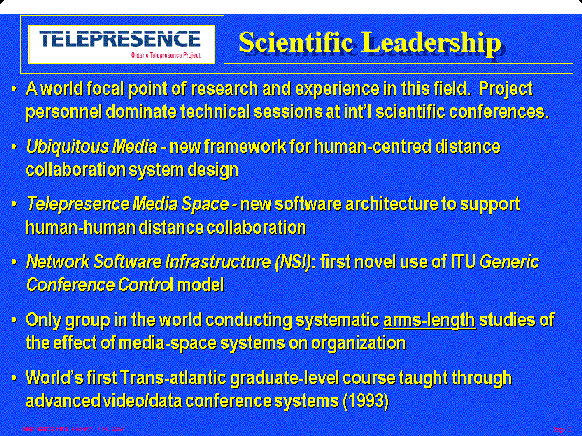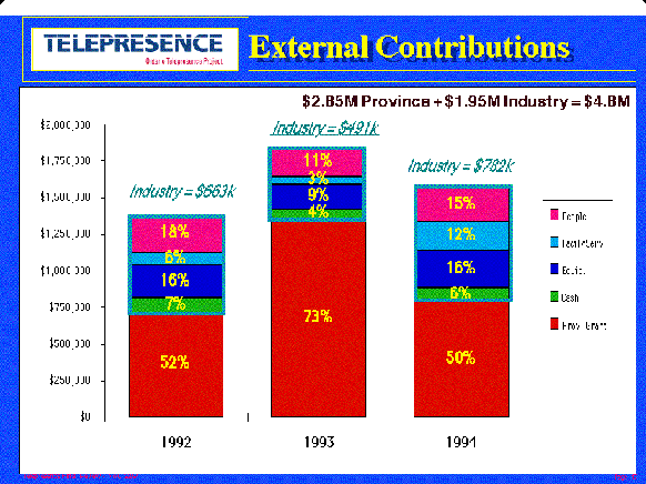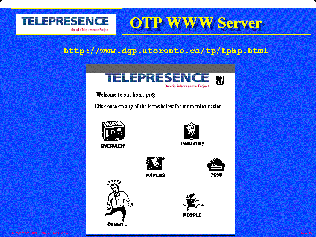 Below are a number of slides presented by Ron Riesenbach at the Ontario Telepresence Project Final Review on November 22nd, 1994. We were pleased to present the accomplishments of the Ontario Telepresence Project. After 3 years of advanced research, experimentation, and technology transfer, this joint ITRC-TRIO project has successfully fulfilled its mandate and will shortly conclude. This meeting examined the impact Telepresence had on the technology, sociology and econimics of Canada's information infrastructure. The day's activities included presentations and demonstrations of the project research results as well as a discussion of the benefits derived by Ontairo firms. Approximately 125 representatives from Ontario firms, academia and government were in attendance.