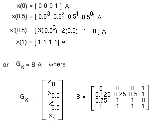 x(0) = P1 = [ 0 0 0 1 ] A_h x(1) = P4 = [ 1 1 1 1 ] A_h x'(0) = R1 = [ 0 0 1 0 ] A_h x'(1) = R4 = [ 3 2 1 0 ] A_h