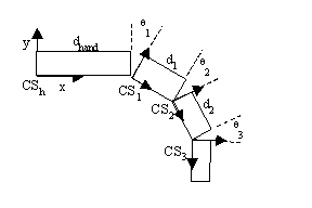 f2: trans(d1,0,0) rot(z,th2) f3: trans(d2,0,0) rot(z,th3) M=M*Thand