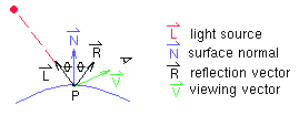 The last component of the commonly-used local illumination model is one that takes into account specular reflections. The following figure illustrates the situation: