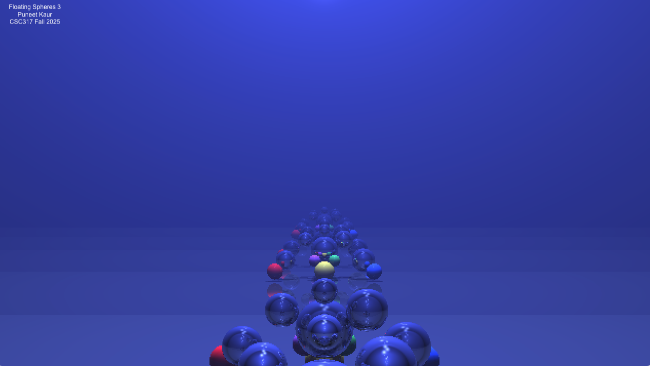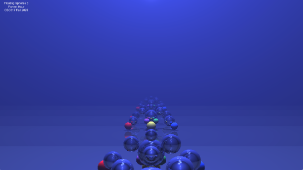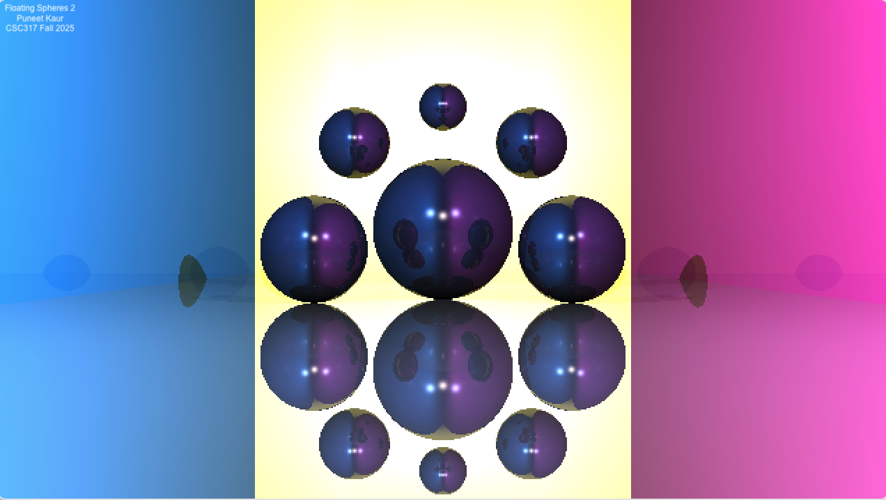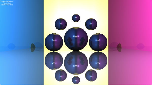 This version simplifies the scene, focusing on the floating crystal spheres over a mirror plane with three colored planes in the background. By removing extra triangles, the piece emphasizes symmetry, reflections, and light. Implemented using the spheres, mirror plane, and three background planes in the JSON scene.