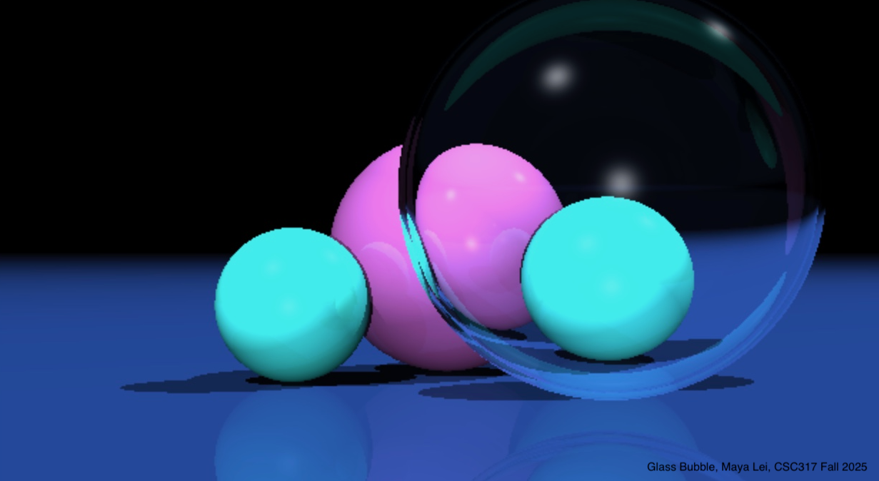 By Maya Lei→I updated the ray tracer to include refraction calculations, along with the already implemented reflection calculations. This can be seen in the rendered piece as the hollow glass sphere/bubble, which refracts light; that is, objects behind it are visible and slightly deformed as light bends through the sphere.