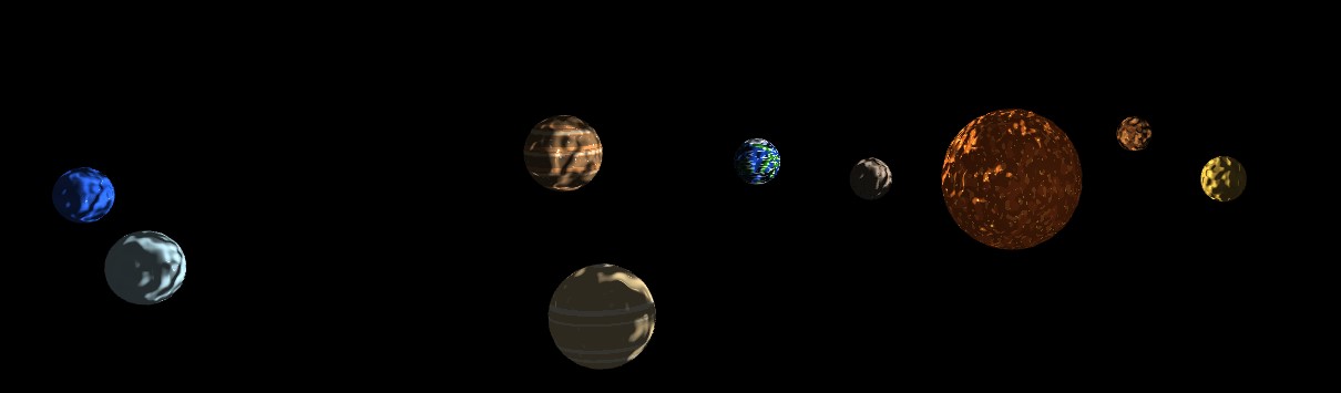 By Shabornee Saha→A realistic solar system simulation using OpenGL shaders with dynamic textures, individual rotations, and lighting effects. Features the Sun and 8 planets with unique visual characteristics orbiting around the Sun and individual planet rotation.