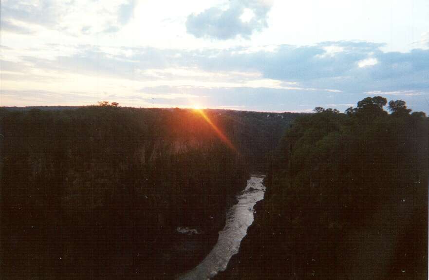 of alamut (aluh amut is 'eagles teaching' in daylami), up in the elburz mountains of syria. they were known as the "hasheesh nasheen" or hasheesh-takers, which the europeans pronounced as best they could... assassin! in an hour i am in vic falls, a cabbie eddy takes me into town, points out a mock tourist village along the way, tells me to avoid the moneychangers... its ok if he is around he says hoping i might have some money to change. i have him drop me off at the setabezi lodge, a cheap place that an advert for was lying on the floor at the travel agents office. its an italian style villa about 2 km from town. the rooms are clean and quiet. check in, have a cup of coffee and head to town. buy a few zambezi's from the supermarket. zimbabwean beer selection is zambezi, castle, lion, bollingers... all fairly light lagers. i sip on one as i walk around town. its hot and a little humid, the onset of rains is nigh. too many touts trying to to sell one too many activites from bungi to game safaris. i have a shearwater gift voucher for a helicopter ride over the zambezi from some diplomatic spouses association fund raiser. the guys at shearwater also run a river rafting operation on the zambezi and i manage to trade the chopper ride in for the crazy opportunity to spend the next day in a rubber dinghy hurtling down the zambezi. then i walk on towards the falls. another tout catches up with me. you want some activities, brother... same old spiel. i tell him i am already booked. he says where you from. i say india. he says many rich people in india. i say many rich indians in africa, most indians very poor. to most africans, indian is like american, rich tourist... anyway, so he says i am lucky to be a tourist so i can drink beer in the street, the police let foreigners go but its a 80 zim dollar fine if you are local. 1 US dollar is 55-70 zim dollars depending on where you change the money.