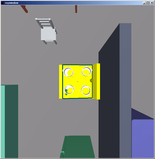 Where one needs it, exact placement is readily available. Here the monitor is told to appear at a precise location. Notice that the monitor is not back facing, upside down, or on its side. This is not accidental. The information in the semantic database ensure that new objects are reasonably oriented when they are placed.