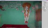 The application is an implementation of Haeberli's paper "Paint by Numbers" (SIGGRAPH '90), applet here. The user selects an input image, and then paints onto a blank canvas, where colour is sampled from the image. The user can select the type of brush, stroke thickness and distribtion settings, impose an ordering on the strokes, and choose whether and how the strokes should orient themselves in the direction of edges in the original image. The result is an image which appears to be artistically in the impressionist style.