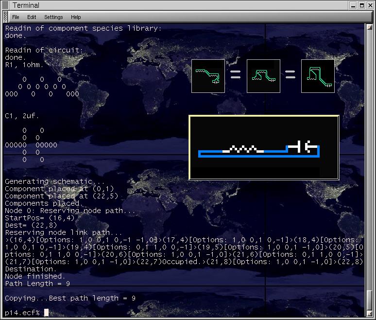 This program contains an algorithm which, when given an electronic circuit, automatically generates a schematic diagram. For each connection, a "feeler" is sent out from one pin, gravitating toward its destination, and backtracking if it becomes trapped. Spatial rendering gives each component and connection its own territory on the diagram. Several randomly-altered diagrams are created, and the best one is chosen as the output. The algorithm design is quite versatile: by making a few changes to the drawing rules, it could generate the copper trace patterns used for manufacturing printed circuit boards.