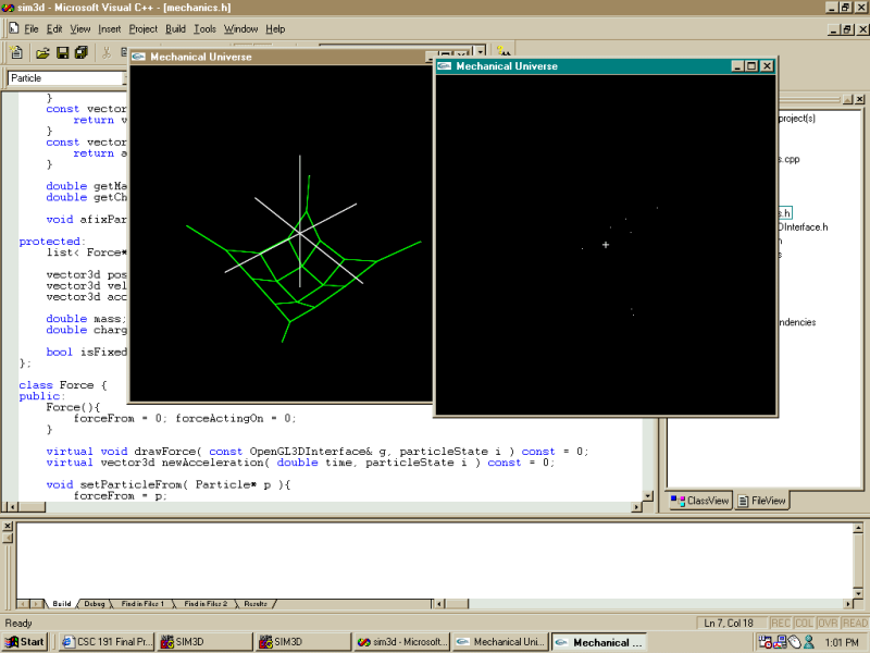 Pictured in the screen shot: On the left is the program simulating a system of springs, and on the right is the same program simulating a system of particles attracted to one another by gravity.