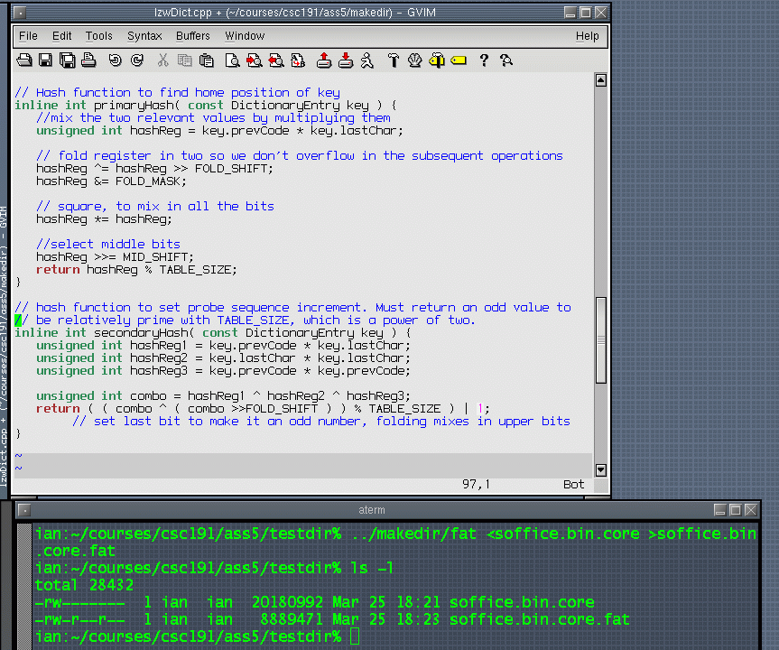 Image Description: The upper part of the image shows the code for the two hash functions used in the program, as highlighted by gvim. The lower terminal shows the command line to compress a file and the resulting reduction in size, with gratuitous use of aterm in transparent mode, albeit on a fairly bare-bones background (so my desktop is minimal).