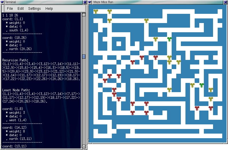Image: In the maze, the little head figures are supposed to be Mickey mice (drawn by OpenGL). Mickey starts at the left-upper corner and exits somewhere on the right. The head figures of Mickey are placed at all intersections that Mickey must pass to get to the exit. Red Mickeys are the dumb ones, they recursively finds the exit. The green Mickeys are more intelligent, they find the shortest path to exit. The yellow ones are common intersections for both red and yellow Mickeys. The terminal to the left displays paths in coordinates as well as the information contained in every node (intersection).
