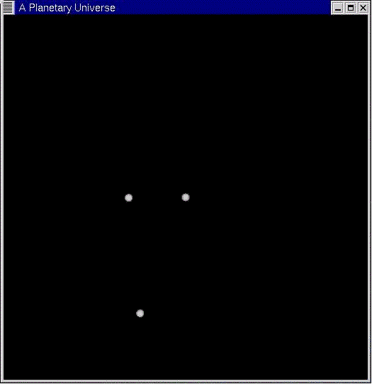 [ marouch ] The above universe consists of a variety of planets orbiting a single body. Optimal stability of the simulation exists with three planets as shown above. In this case the two orbiting bodies are the Earth and Mars. The last screenshot shows the same scene but from a different perspective and using wireframe rendering. Note: Planetary sizes are not drawn to scale.