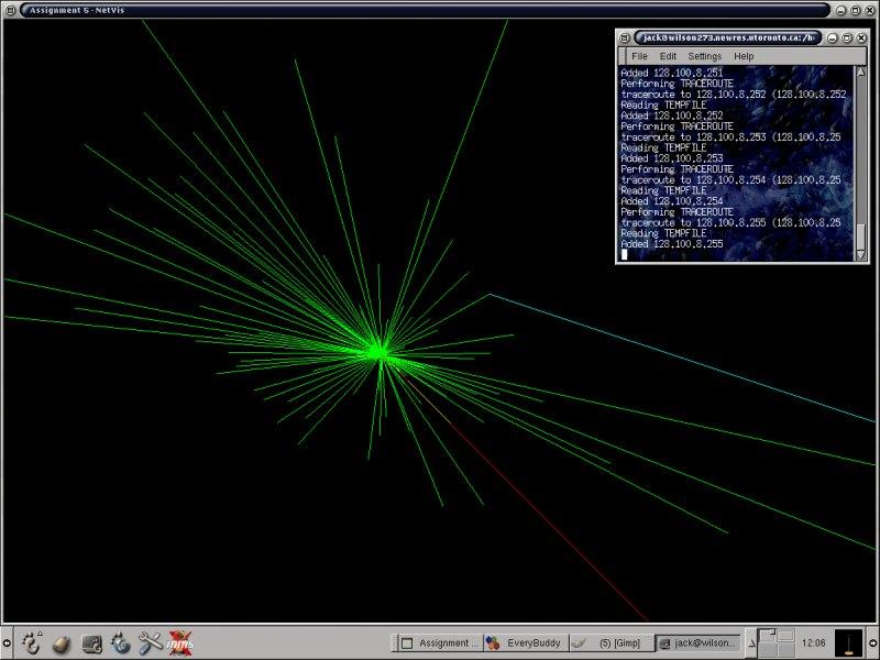 [ mcdermo ] My program provides visualization of the latentcy and temporal distance between hosts in a computer network. A series of hosts are probed with the `traceroute` command, and the resulting times rendered as a wireframe graph with OpenGL. The image above shows a mapping all hosts in the Class C subdomain 128.100.8.*, which contains the ECF network's web server and pentium workstations. The blue line in the upper right shows my route into the network, the green lines are for hops of less than 50ms, and there is a single red line showing a hop of more than 50ms (some non-responsive host).
