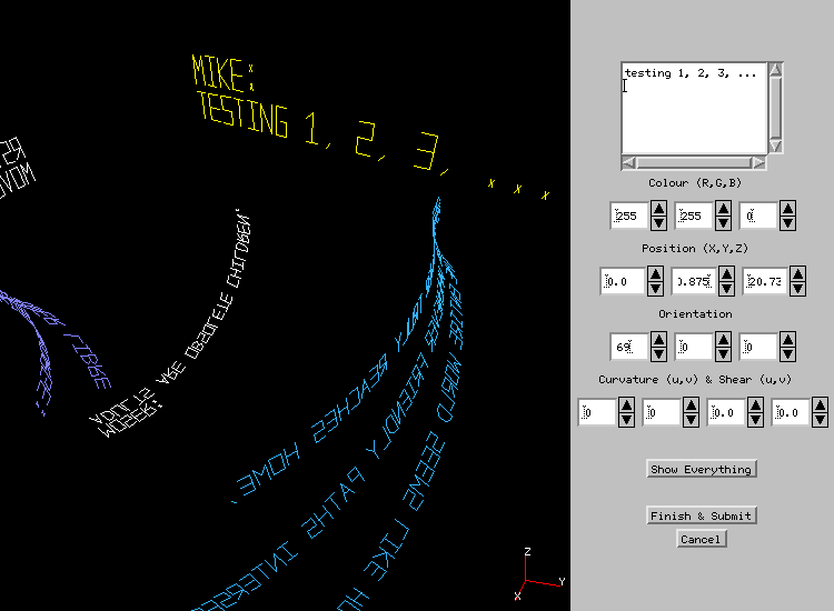 CollectiveSpace1 is an effort to create a space for collective creation and expression. The space contains messages suspended in 3D. Visitors can navigate through the space and post new messages - positioning & orienting them with respect to the existing body of messages, and optionally deforming their shape.