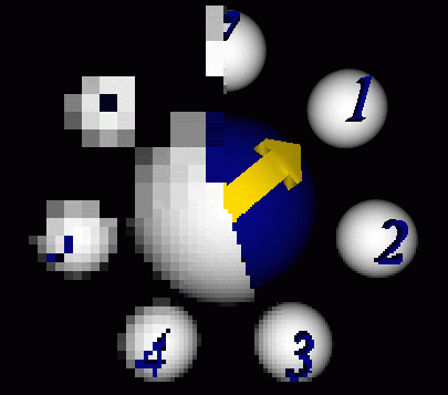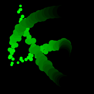 An example of "alpha blending", a computer graphics technique for simulating transparent objects, in this case in a pseudo-physical manner. Blue spheres are arranged along a surface generated by revolving a sinusoidal curve. The white dots of reflected light are specular highlights.