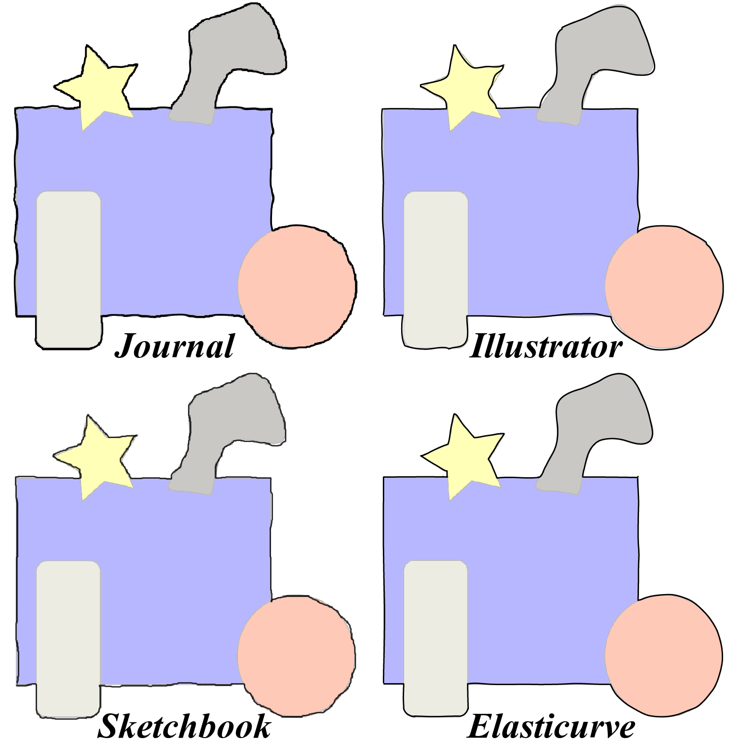 Further, we evaluated elasticurves relative to existing research by compare elasticurves to three popular commercial systems: Windows7 Journal, Illustrator CS5 and Sketchbook-Pro 2010. We asked an intermediate user to trace the outline of a background image using all four techniques. After a few strokes to gain familiarity with all systems, the user traced over the image with a single stroke. The four techniques were used in turn and repeated overall 7 times. The neatest visual result of each technique using a trackpad is shown below.