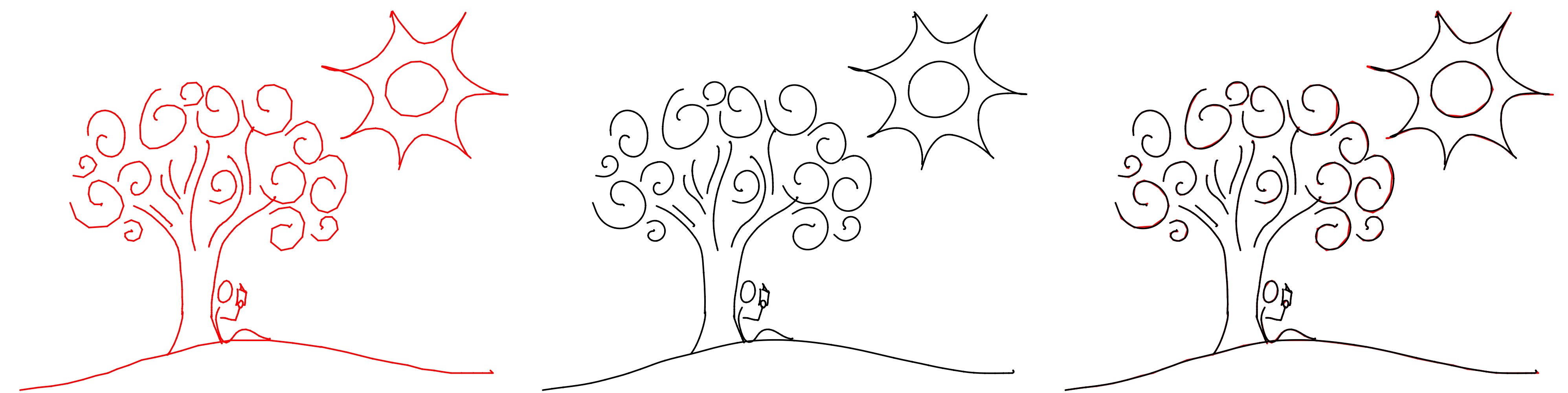 We evaluated our system by distributing it to 6 users and asking them to try it out and send us their creations. We did not specify which input method they should use; two used a tablet computer, one a trackpad and three a mouse. Each user was aged between 20 and 40, had a familiarity with computers and drawing ability varying from professional to completely inexperienced. Notably, the experienced users used tablets, while the inexperienced ones used a mouse or trackpad as their input device. Here is a sample of the sketches submitted, with the input shown in red and the neatened sketch shown in black.